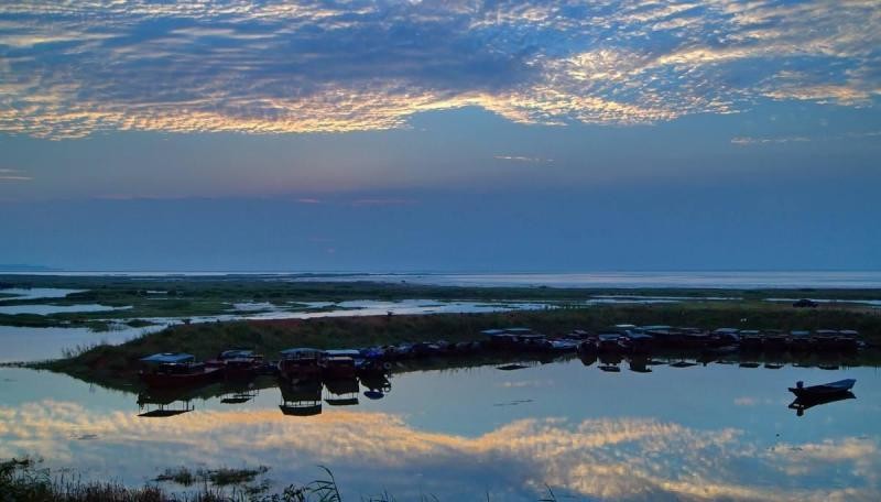 鄱阳湖的古称很多:彭蠡泽、彭泽、官亭湖、扬澜、担石湖等等,不下十个。这倒不是因为它有许多渊源,而是由于它兼并了许多小湖,逐渐扩大,同时也并蓄了那些小湖的名字。它本初的乳名源自大禹治水时期,这片地区因地势低洼,形成了数条分汊状水系,所以取古汉语中表数量多的虚词“九”,称其为九江。《禹贡》中记载“九江孔殷,东为彭蠡。”彭者,大也;蠡者,瓠瓢也,即葫芦。也就是说,这片洼地湖泊,自古就形似葫芦瓢。