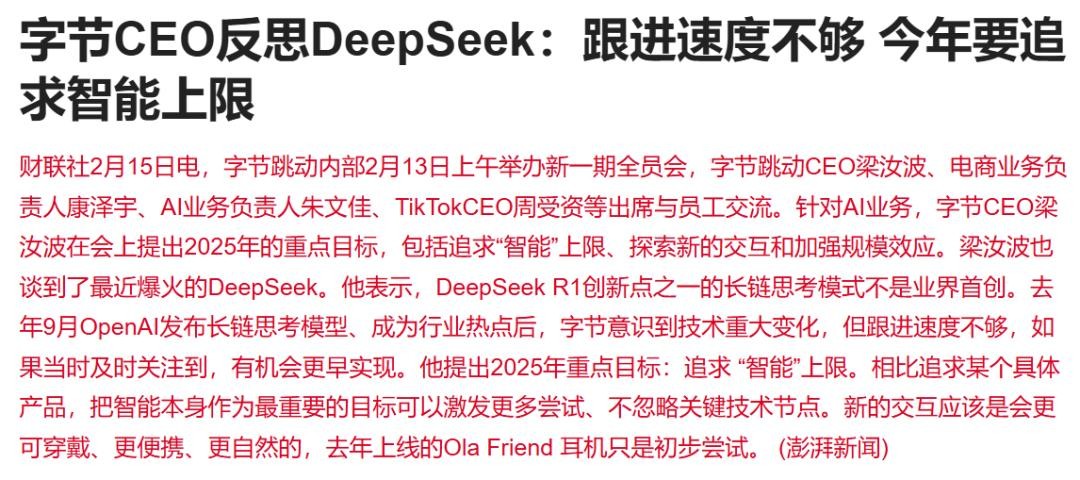 字节跳动CEO梁汝波反思认为,DeepSeek-R1的长链思考模式并非业界首创。去年9月,OpenAI发布长链思考模型成为行业热点,字节虽意识到技术的重大变化,但跟进速度不足,若当时及时争先,或许有机会更早实现。