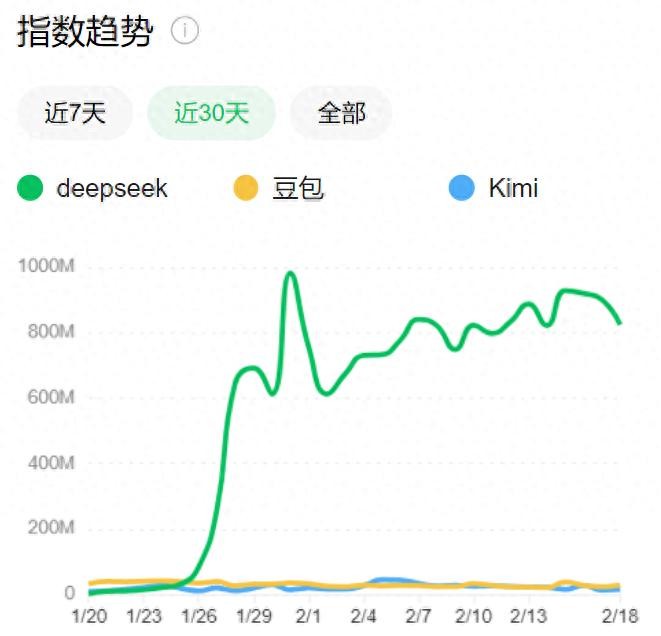 微信指数显示,近30天,豆包、Kimi的微信指数平均值分别为3千万和2100万左右,而DeepSeek微信指数平均值达到了5.9亿,峰值更是逼近10亿,是豆包、Kimi的数十倍。