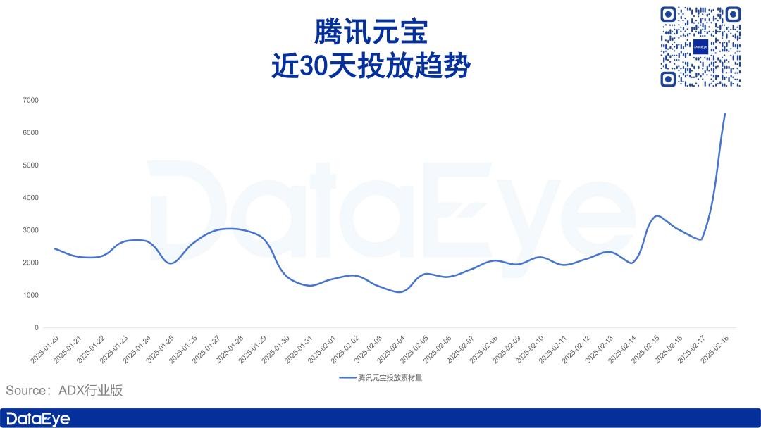 ADX行业版数据显示,2月1日至14日,腾讯元宝投放力度始终保持在相对低位,日均投放素材量约2000组,2月15日起,投放力度迅速攀升,日投放素材量峰值超3400组,至2月18日,腾讯元宝日投放素材量再达新高6570组。