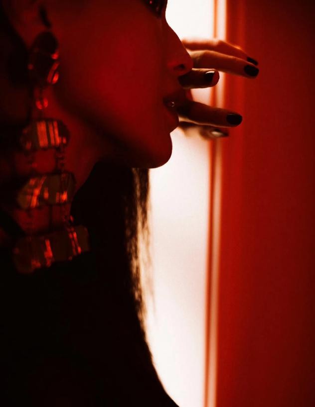 她巧妙地穿着薄纱拼接的服装,展现出色彩分层渐变的效果,给人以视觉上的享受,同时也体现了她对细节的把控能力。