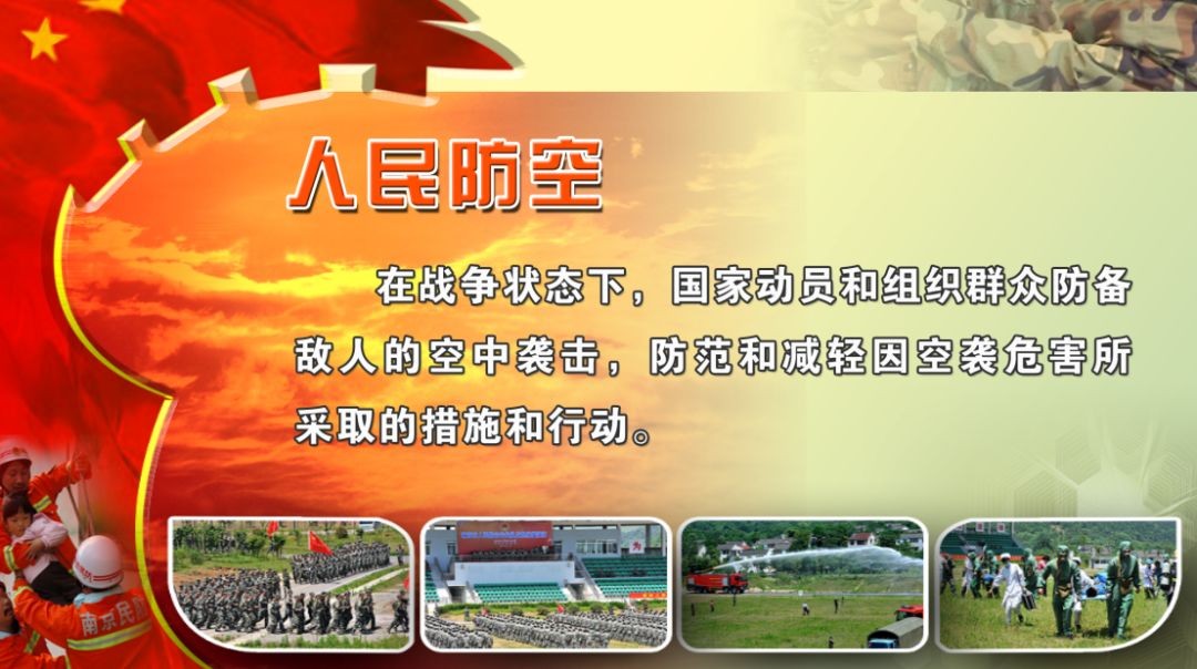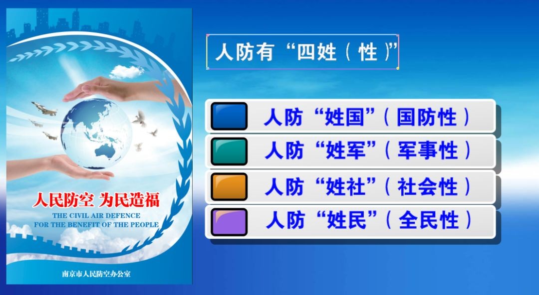 4、人防“姓民”(全民性)人防的根本目的是防范和减轻空袭危害,保护人民生命财产安全,动员、组织和依靠人民是人防建设的力量源泉。国外人防通称“民防”,即民众保护或公民防护,其防备的主要对象是敌方的空中袭击,防护主体是平民。一些发达国家普遍将公众防空与防灾救援职能赋予民防部门。