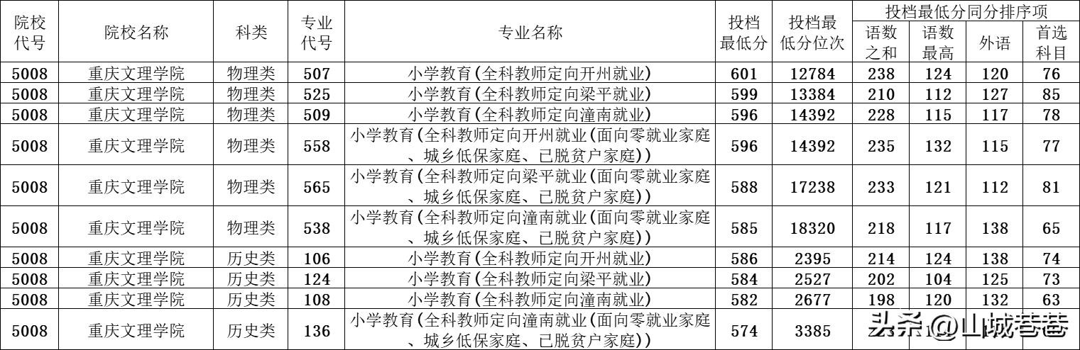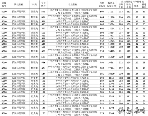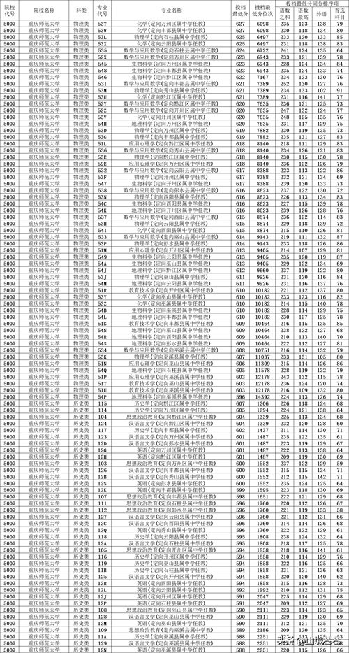 历史类投档分数线在607-588分,最高的是定向黔江区属中学任教的历史学607分,其次是定向万州区属中学任教的历史学605分,最低的是定向巫溪县属中学任教的历史学、汉语言文学、英语588分,最低分位次2251.