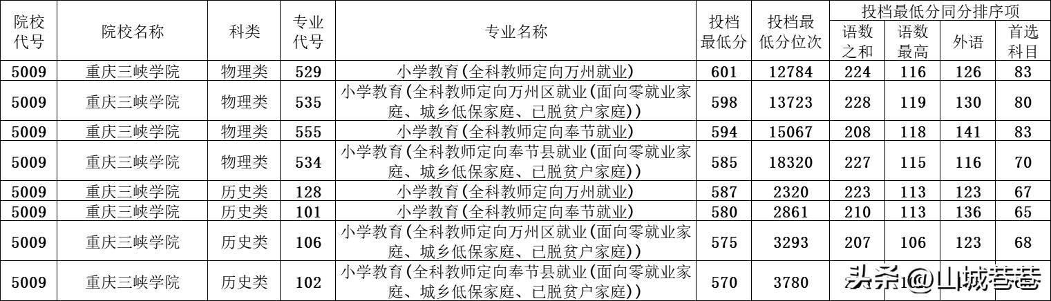 重庆三峡学院地方公费师范生物理类投档分数线在601-585分,最高的是定向万州就业601分,最低的是定向奉节就业(面向零就业家庭、城乡低保家庭、已脱贫户家庭)585分,最低分位次18320.历史类投档分数线在587-570分,最高的是定向万州就业587分,最低的是定向奉节就业(面向零就业家庭、城乡低保家庭、已脱贫户家庭)570分,最低分位次3780.