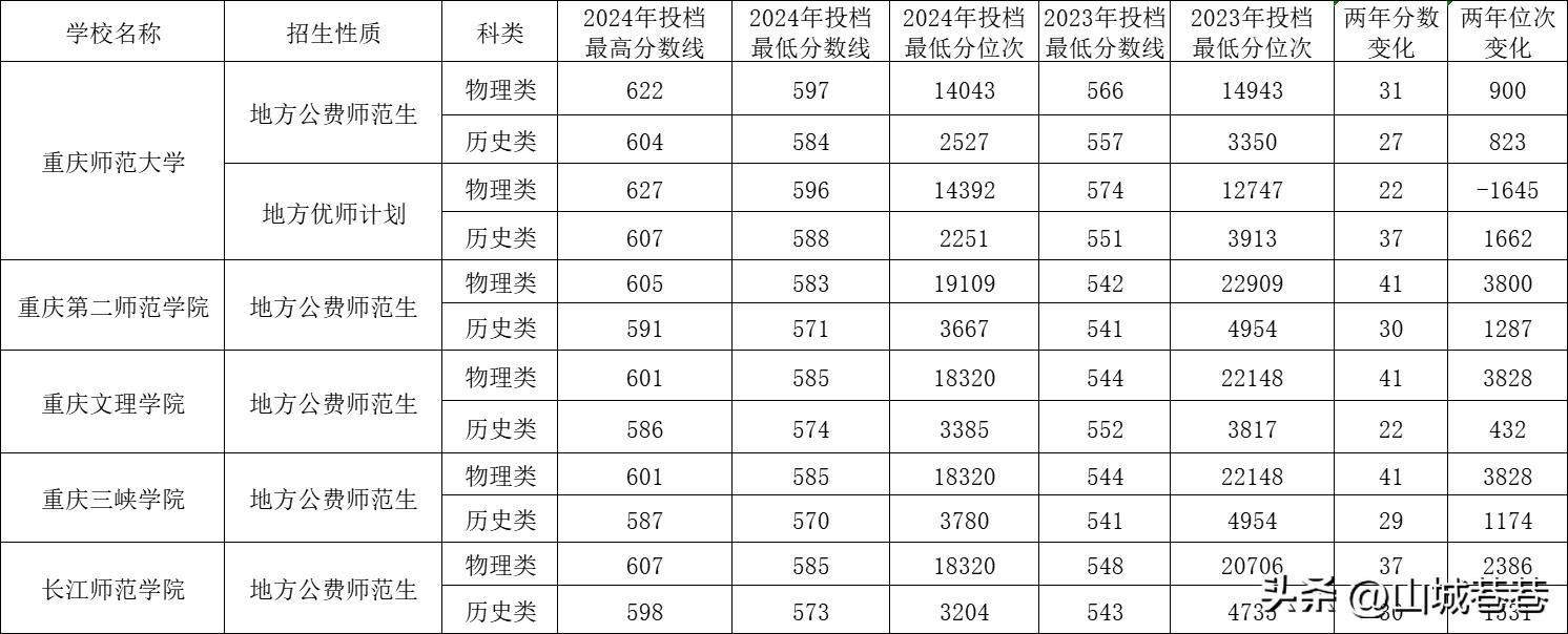 同去年相比,重庆师范大学2024年地方公费师范生物理类投档最低分597分,比去年(566分)提高了31分,录取位次(14043)比去年(14943)上涨了900位。