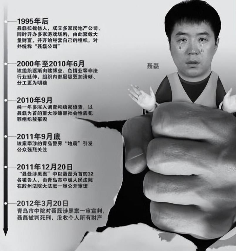 青岛市最大的黑社会案件之一的主犯聂磊,因涉嫌组织、领导黑社会性质组织罪等十项罪名,被判处死刑,并于2013年9月17日被山东省青岛市中级人民法院依法执行注行死刑。据悉,聂磊在临刑前一夜连抽了5包烟,见到母亲时嚎哭不止。