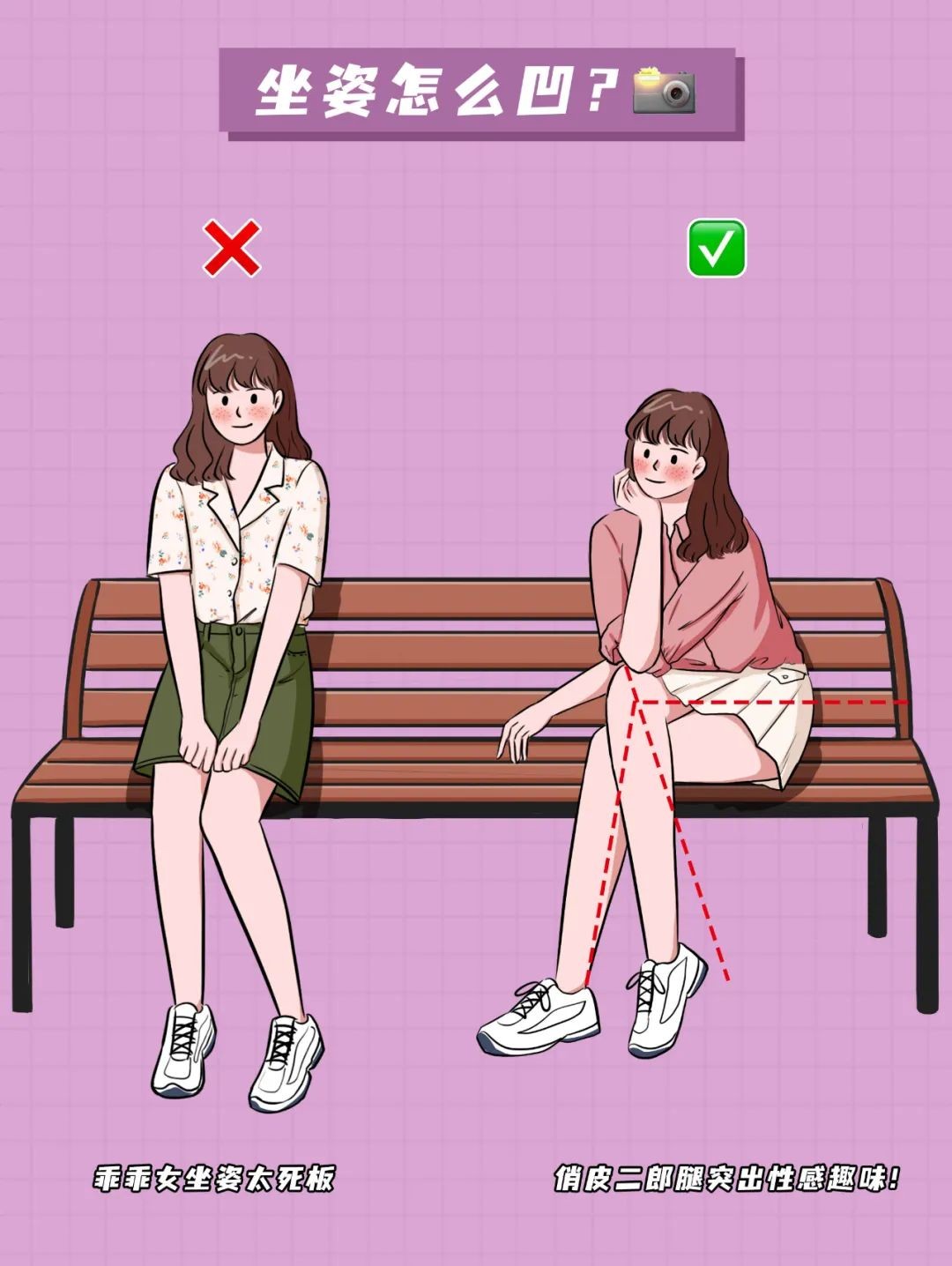 坐姿太乖会让你看上去像小学生,拍照的时候尽量歪一下身体,翘个二郎腿、托个腮啥的,既精致又得体。
