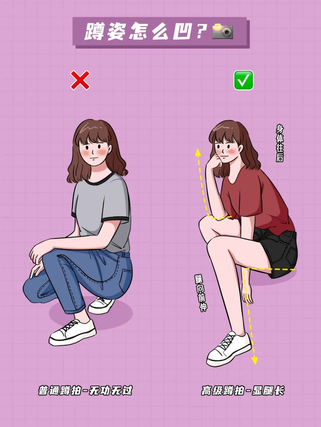 蹲拍最关键技巧在于:身体可以弯曲但后脊背一定要绷直!尽量半蹲,手脚并用,屁股微翘,有大长腿的人,不要吝啬伸腿啊!