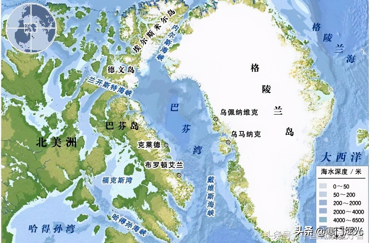 格陵兰岛是世界最大岛,面积2166086平方千米,在北美洲东北,北冰洋和大西洋之间,从北部的皮里地到南端的法韦尔角相距2574公里,最宽处约有1290公里,海岸线全长三万五千多公里。全岛五分之四在北极圈内,84%的面积为厚冰所覆盖,冰盖平均厚2300米,中部最厚达3400米,人口约5万,为丹麦领土。