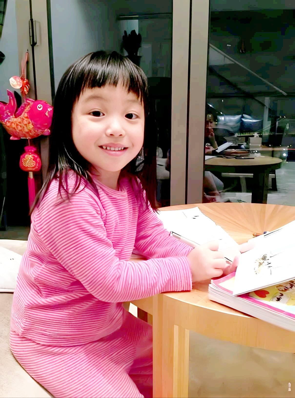 小姑娘一头乌黑长发垂肩,面带微笑看着镜头。她身着粉红色家居服,坐在圆桌旁写作业,身后窗户上挂着一条象征吉祥、喜庆的布偶鱼。