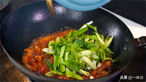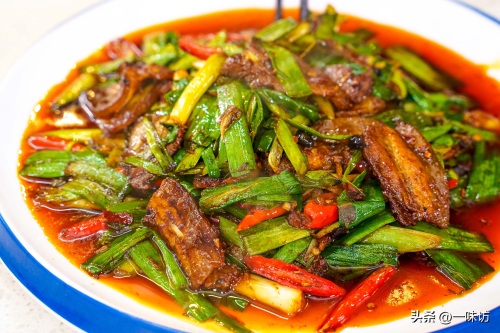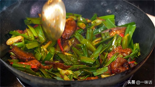 再下去蒜苗叶炒香装盘,快速翻炒就可以出锅。