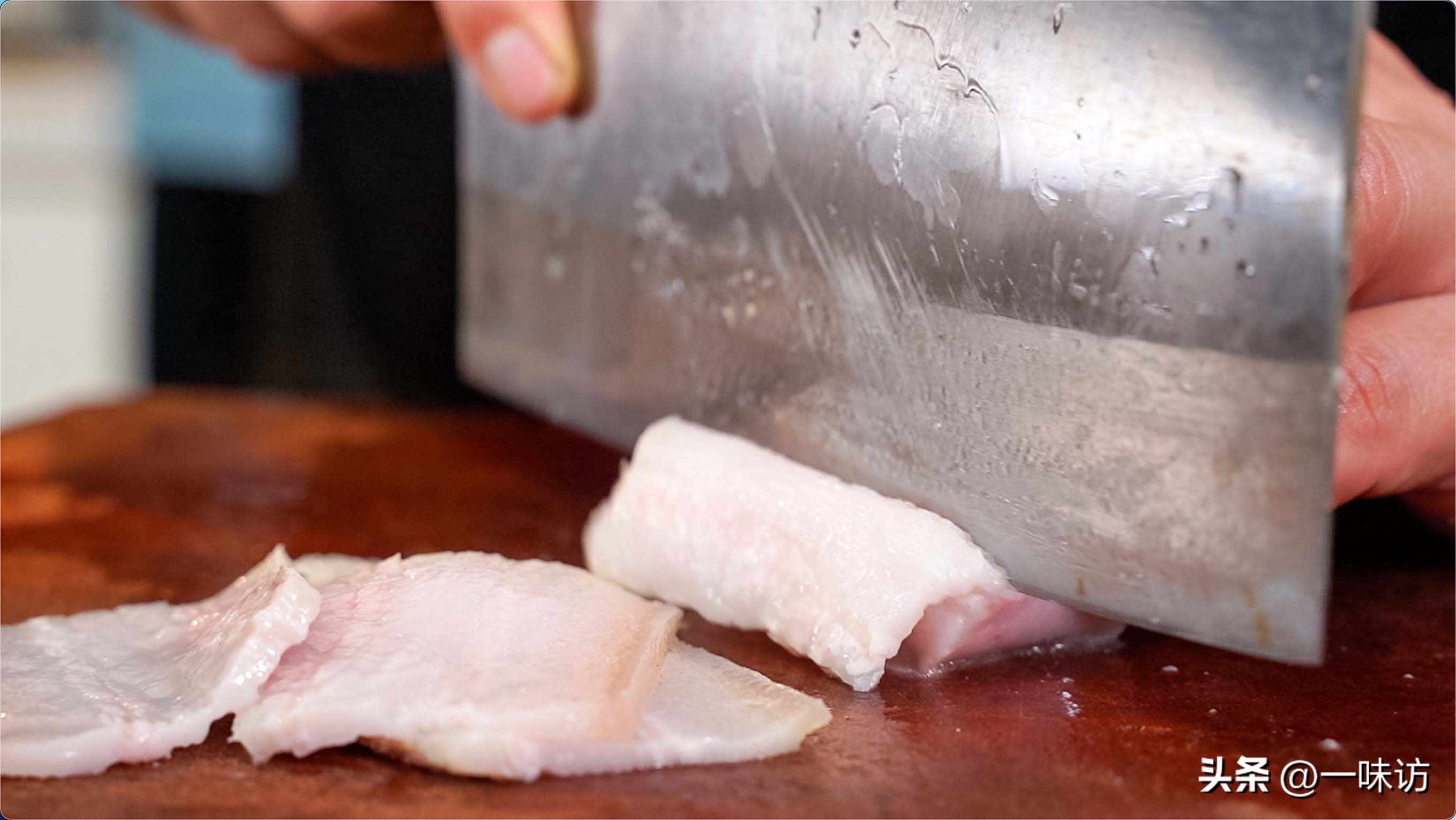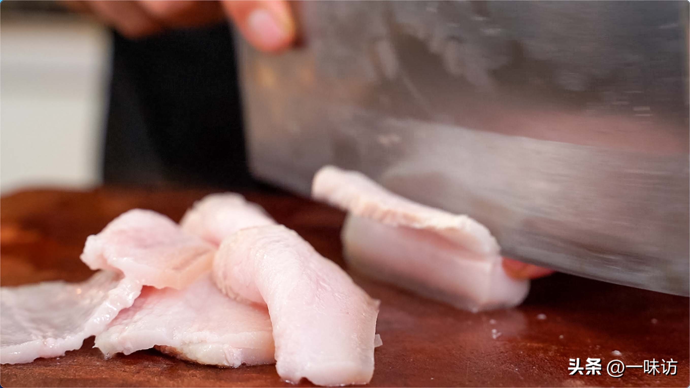 我们将五花肉切成薄片,差不多这个薄度就可以,不可以切太厚这样吃起来会影响口感。