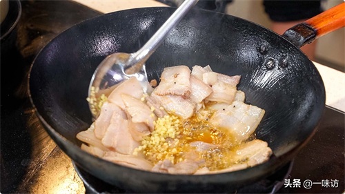 锅中下去切好多五花肉片,加入生姜一起炒香,主要去除腥味,把油煸出来。将多余的猪油过滤出来一些!