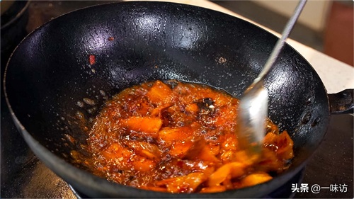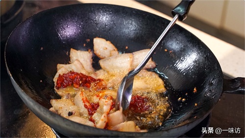 我们再加入豆瓣酱20克 豆豉10克 甜面酱20克炒到肉上色,五花肉的颜色会非常好看。