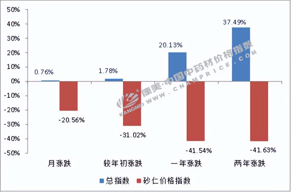 与前年同期(2020年7月28日)相比,下跌了41.63%,比上年同期(2021年7月28日)下跌了41.54%。同期,总指数分别上涨37.49%,上涨20.13%。砂仁价格指数跌幅明显,今年尤其剧烈,幅度明显大于总指数。