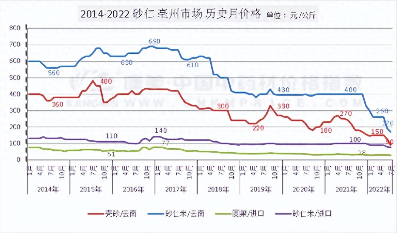 砂仁品种纷杂,尤其进口伪品太多,加上水分和含量监测,市场砂仁品种合格率低至12.5%。市场上正品春砂和海外壳砂价格差异十倍以上,吸引力巨大,从广东到云南及边境已发展数年。2019-2021商家多次抄底,如今市场价格跌破十年前值,失守百元。