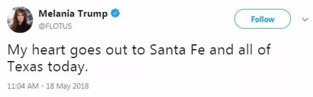 第一夫人梅拉尼娅也发推称:“今天我的心与圣达菲、得克萨斯州的人民在一起”。