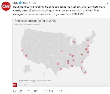 CNN说,这是美国8天内第三起校园枪击案,也是今年第22起,平均一个星期就会发生一起。