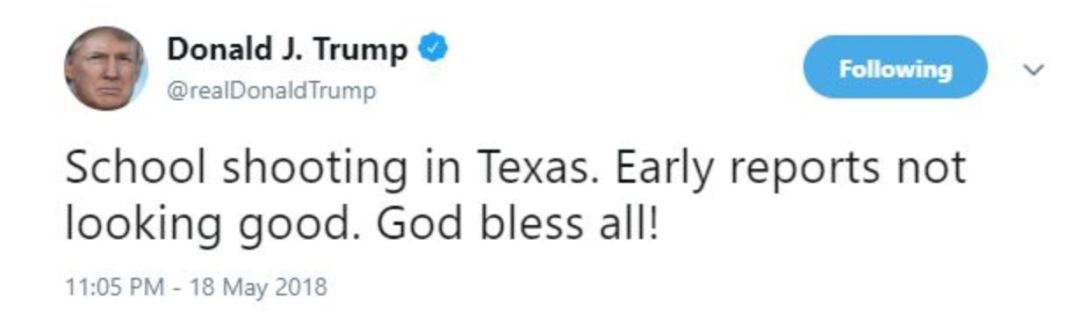 美国总统特朗普迅速在Twitter上对此次枪击事件作出回应:“德克萨斯州发生了校园枪击案。从最初报道看事情很不妙。愿上帝保佑所有人!”