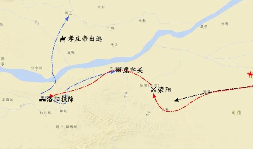 在北魏将领的心目中,陈庆之有如神助是不可战胜的。北魏孝庄帝仓皇逃往河内(今河南沁阳),留在洛阳的北魏朝臣很识相的迎接元颢进入洛阳。五月二十五日,元颢入洛阳继位称帝,改元建武。