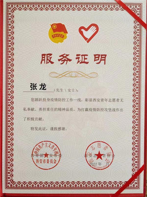 共青团西安市委还为张龙先生颁发了服务抗疫一线的证书