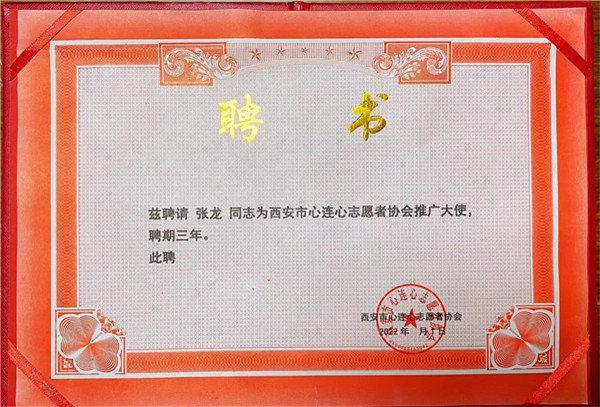 中国品牌推广第一人、西部新闻网总编辑张龙荣膺西安市心连心志愿者协会推广大使