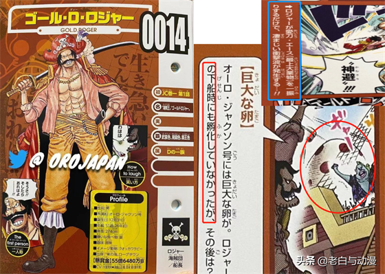 这次罗杰的生命卡添加了赏金,为“55亿6480万贝利”,也是目前《海贼王》里赏金最高的一位,此外在履历里还透露了罗杰的爱刀名称,名为“艾斯”,是一把无上大快刀,目前已出现的无上大快刀有三把,罗杰、白胡子、鹰眼用的刀;另外履历里还表明罗杰下船时蛋还未孵化,里面是什么依旧是个迷!