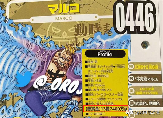 再来则是白胡子海贼团里的赏金,这次公布的赏金有两位,第一位是马尔科,赏金为“13亿7400万贝利”,