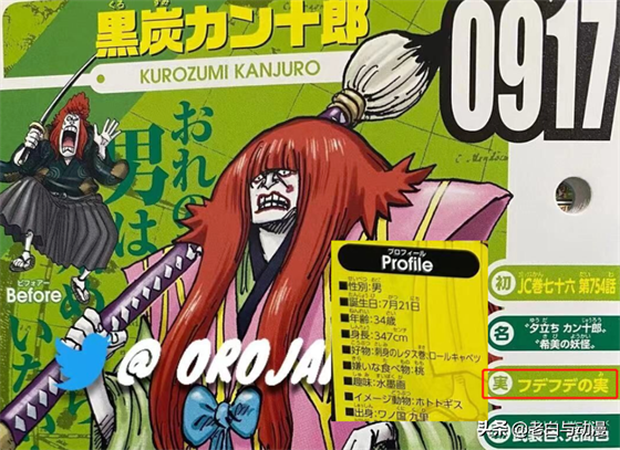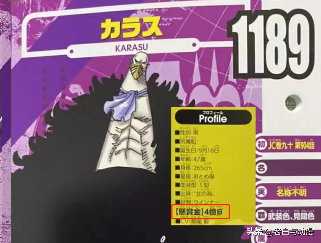 然后是北区军队长【乌鸦】,悬赏金为“4亿贝利”,果实能力尚未公布,从他能变成乌鸦来看,可能是幻兽种乌鸦一类的果实,另外之前不少人猜测乌鸦可能是柯拉松,从资料卡片来看,不可能是他;