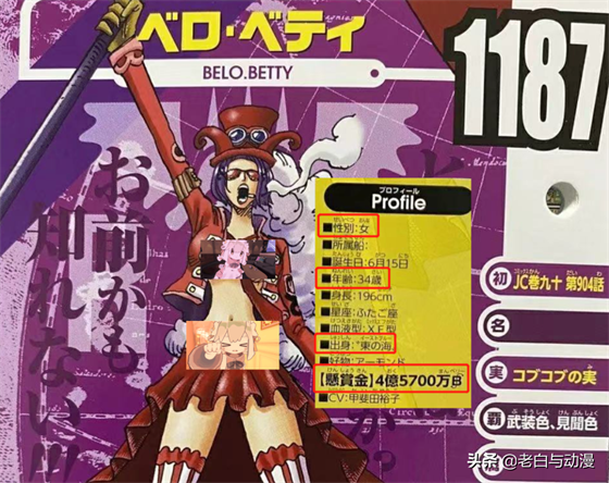 首先是东区军队长【贝蒂】,赏金为“4亿5700万贝利”,从给出的资料卡来看,贝蒂出生东海,年龄34岁,而恶魔果实在她当初登场就公布过,名为【鼓舞果实】。