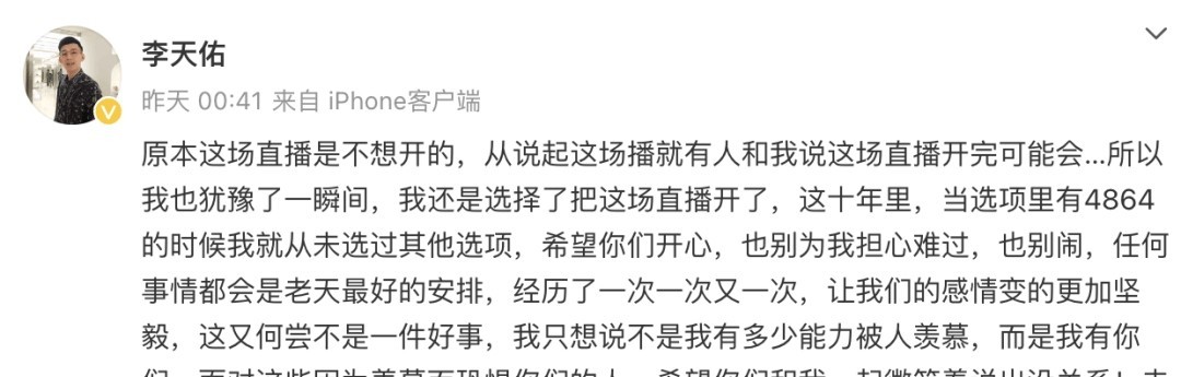 据了解,此次“MC天佑”复出直播的事件源于12月24日凌晨。当时,一个名为@李天佑 的微博账号发布了一条动态,疑似对封禁一事进行回应。该微博写道:“原本这场直播是不想开的,从说起这场播就有人和我说这场直播开完可能会……我也犹豫了一瞬间,我还是选择了把这场直播开了。”尽管该微博并未明确提及直播被封禁的具体原因,但从其言辞中不难感受到一丝无奈与挣扎。