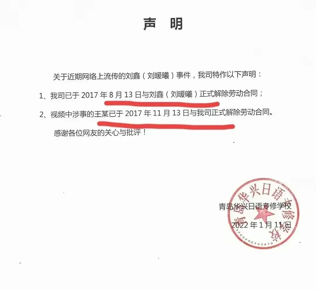 从培训机构的声明看,2017年8月13日,公司已和刘鑫解除了劳动合同。