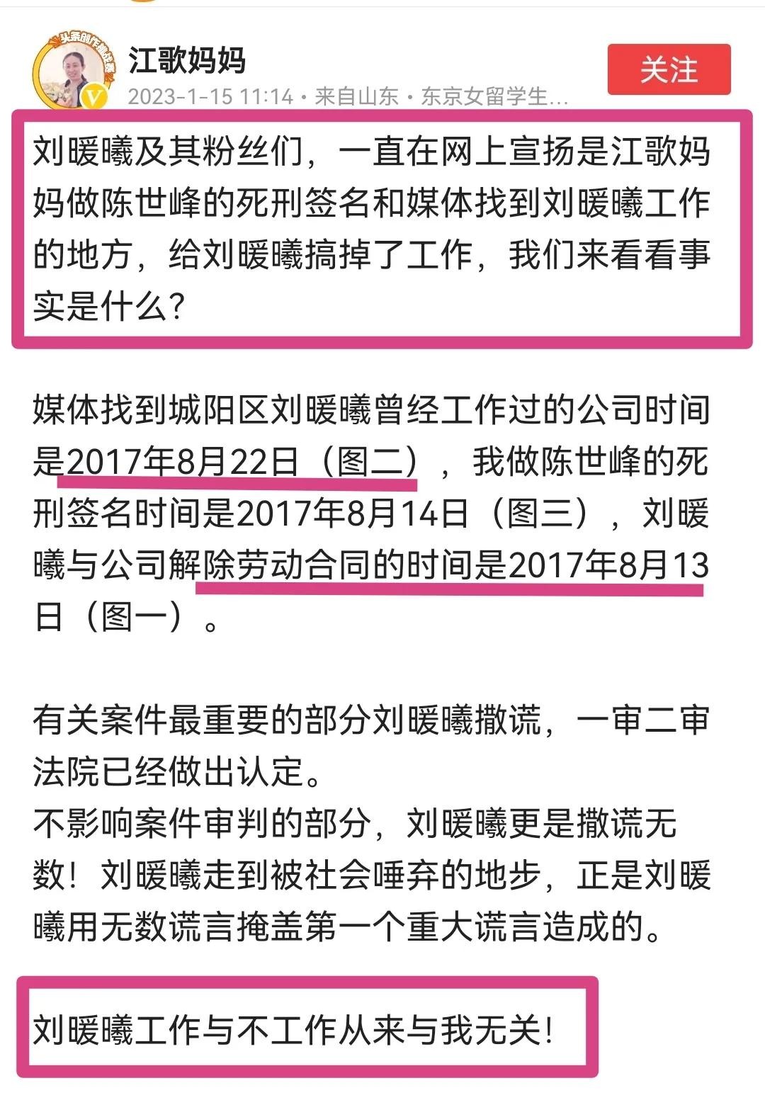 对韩素的说法,江歌的母亲给予了否认,刘鑫丟工作的事与她无关。记者找上门的时间,是在她解除劳动合同后。