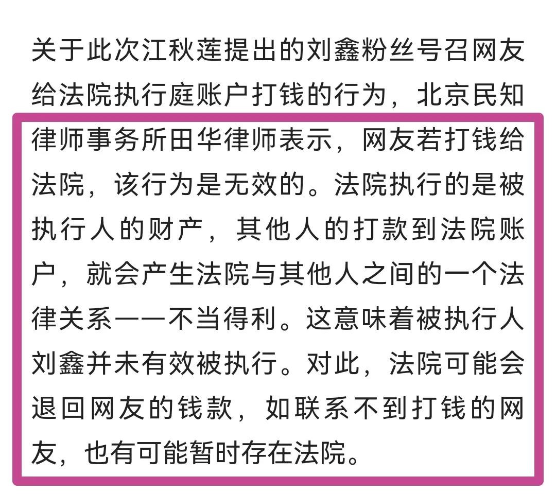 也有人质疑刘鑫粉丝的行为,是否合法?网上有专业人士,给出了自己的看法,认为这种自行打款的行为无效。
