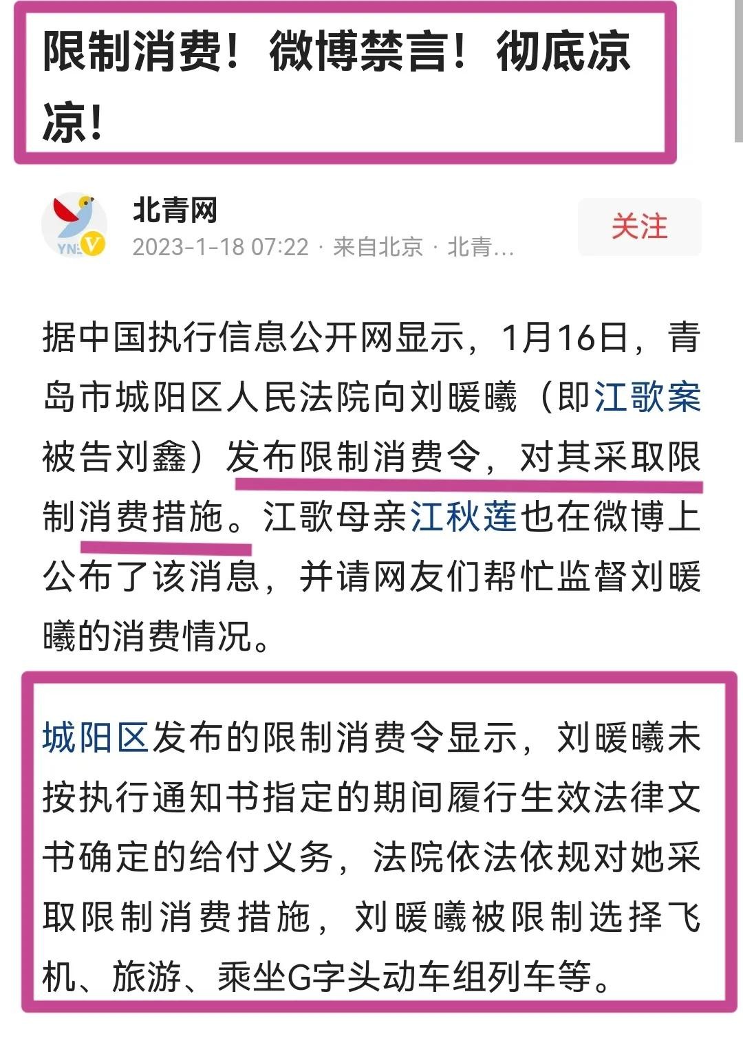 2023年1月16日,法院向刘鑫发布了限制消费令,江秋莲也在网上公开发文,请网友们帮忙监督刘鑫的消费情况。