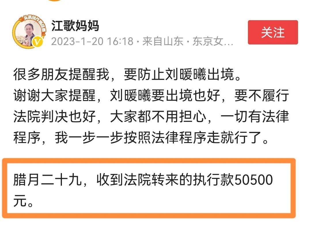 1月20日,江歌母亲发文表示,已收到法院转来的执行款50500元。与刘鑫的粉丝韩素的说法一样,得到了证实。