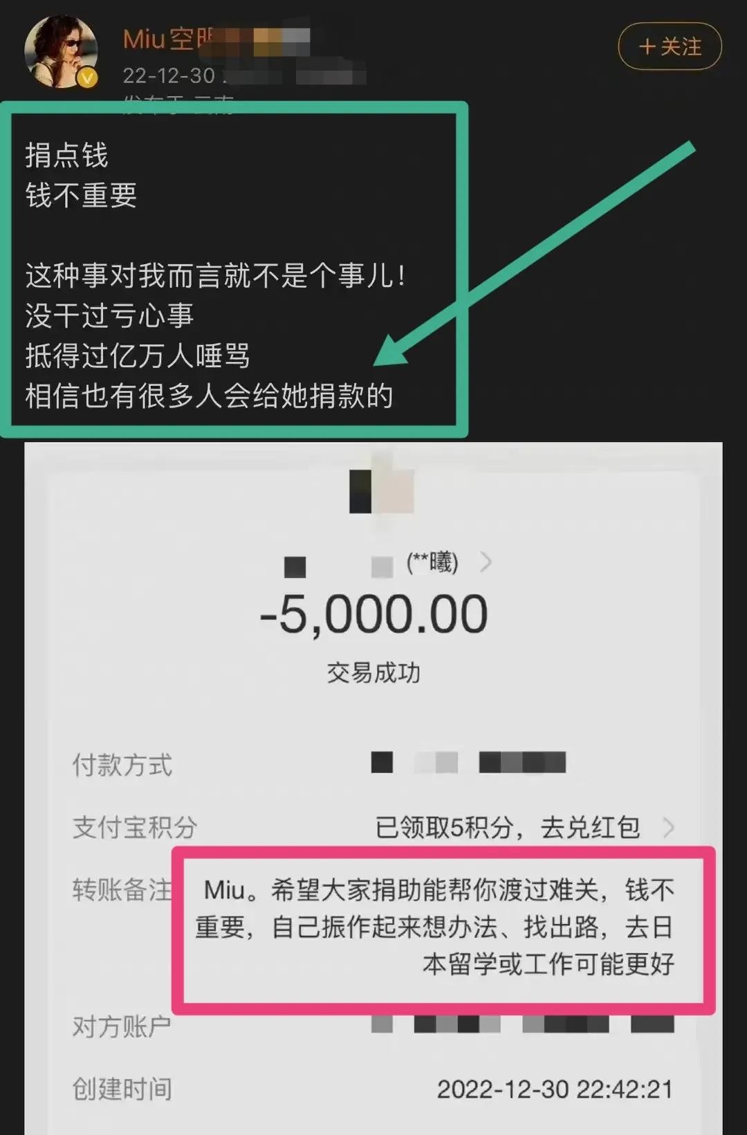 韩素晒出了打款截图,可以看到她转了5000块给中院。有网友嘲笑她,嚷嚷了半天还以为是支持了5万元而已。