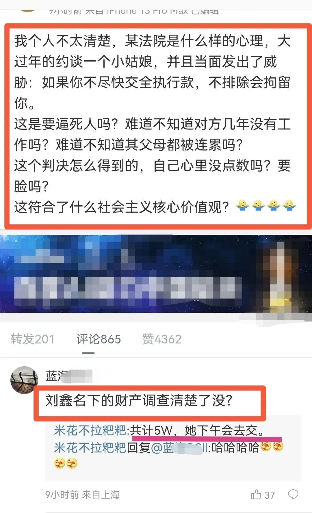 刘鑫粉丝韩素称,她的名下只有五万块。她们自行打款给青岛中院,准备在线下搞众筹的方式,帮刘鑫凑这笔赔偿。