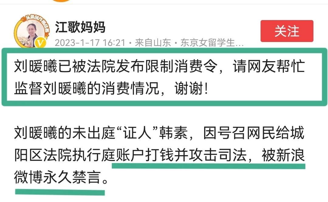 没过多久,韩素的网络账号也因为违反了社区公约,被平台给永久禁言。