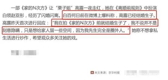 后来高露也回应了此事称自己在拍摄《家N次方》前就已经结婚生子了,并不是刻意隐瞒。只是想给家人留一些空间,毕竟自己的先生完全是圈外人,不想拿私生活炒作。