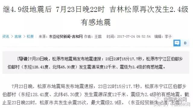 7月23日晚,松原市地震局发布地震速报:23日22时15分17.7秒,松原市宁江区伯都乡伯都村(东经128.41度、北纬45.30度)发生震源深度12千米、震级为2.4级的有感地震。截止至23日晚22时,松原市共发生余震25次,最大震级2.9级。