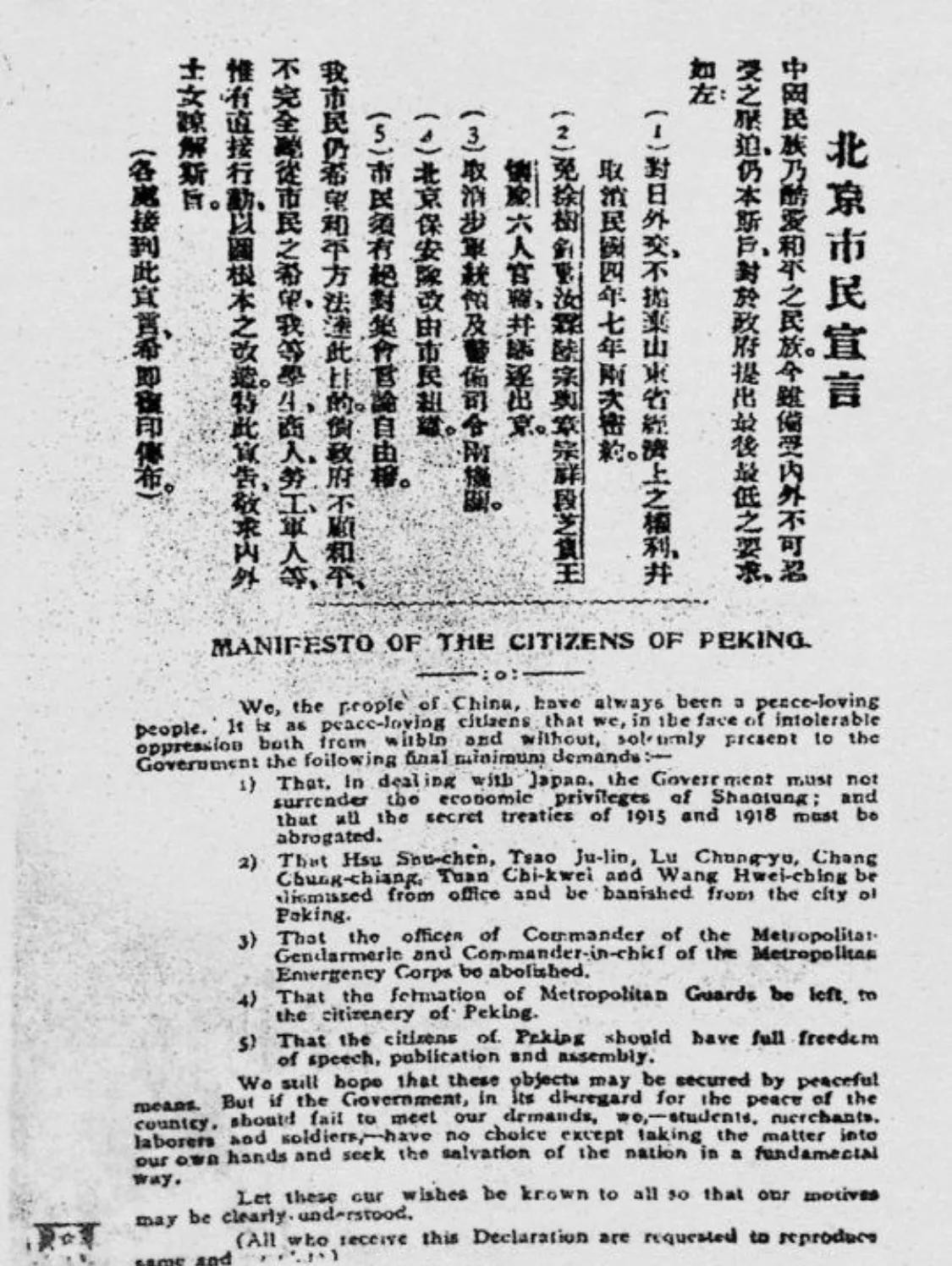 仲甫先生在五四运动期间最为轰动的表现是起草并亲自散发《告北京市民宣言》,提出取消对日密约、罢免卖国官吏、保障市民集会言论自由等。