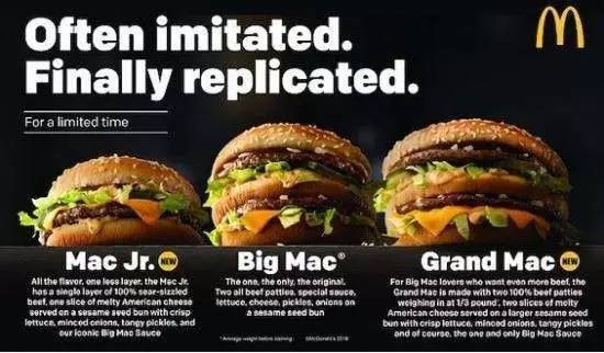 1月底,麦当劳宣布将正式推出小型巨无霸(Mac Jr)和巨型巨无霸(Grand Mac)。这两款已经被测试了大半年的产品在前期收获了不错的反馈,麦当劳于是决定将其推向全国。