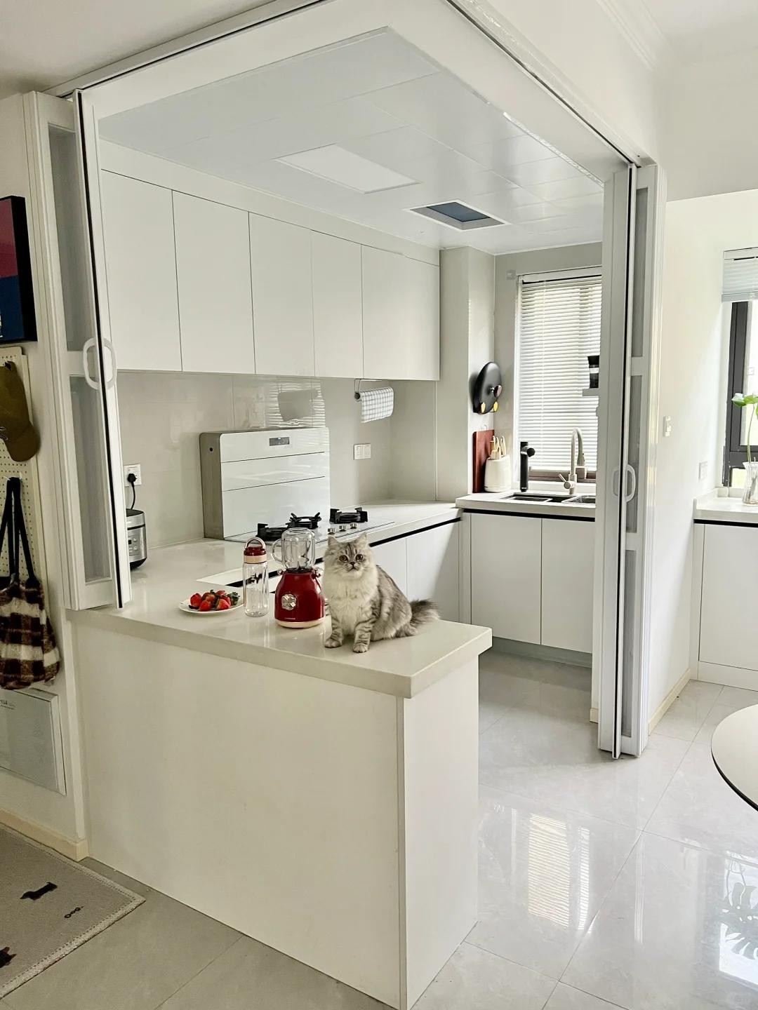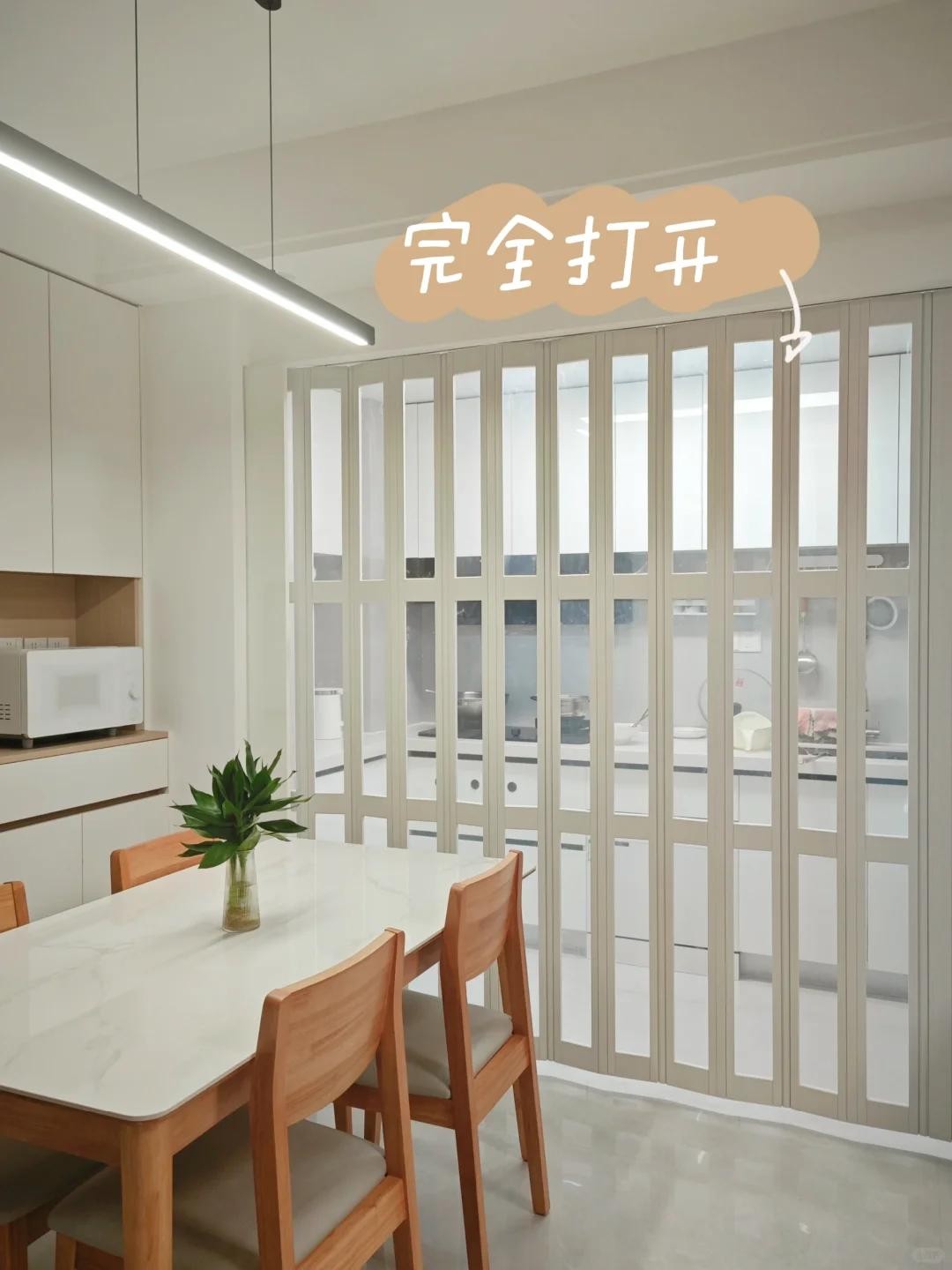 如果厨房比较小,空间很拥挤,选择这种pvc材质的折叠门,真的可以扩大整个空间,而且造价成本非常低,打开之后就是一个开放式的厨房,拉上之后就是一个封闭式的厨房。