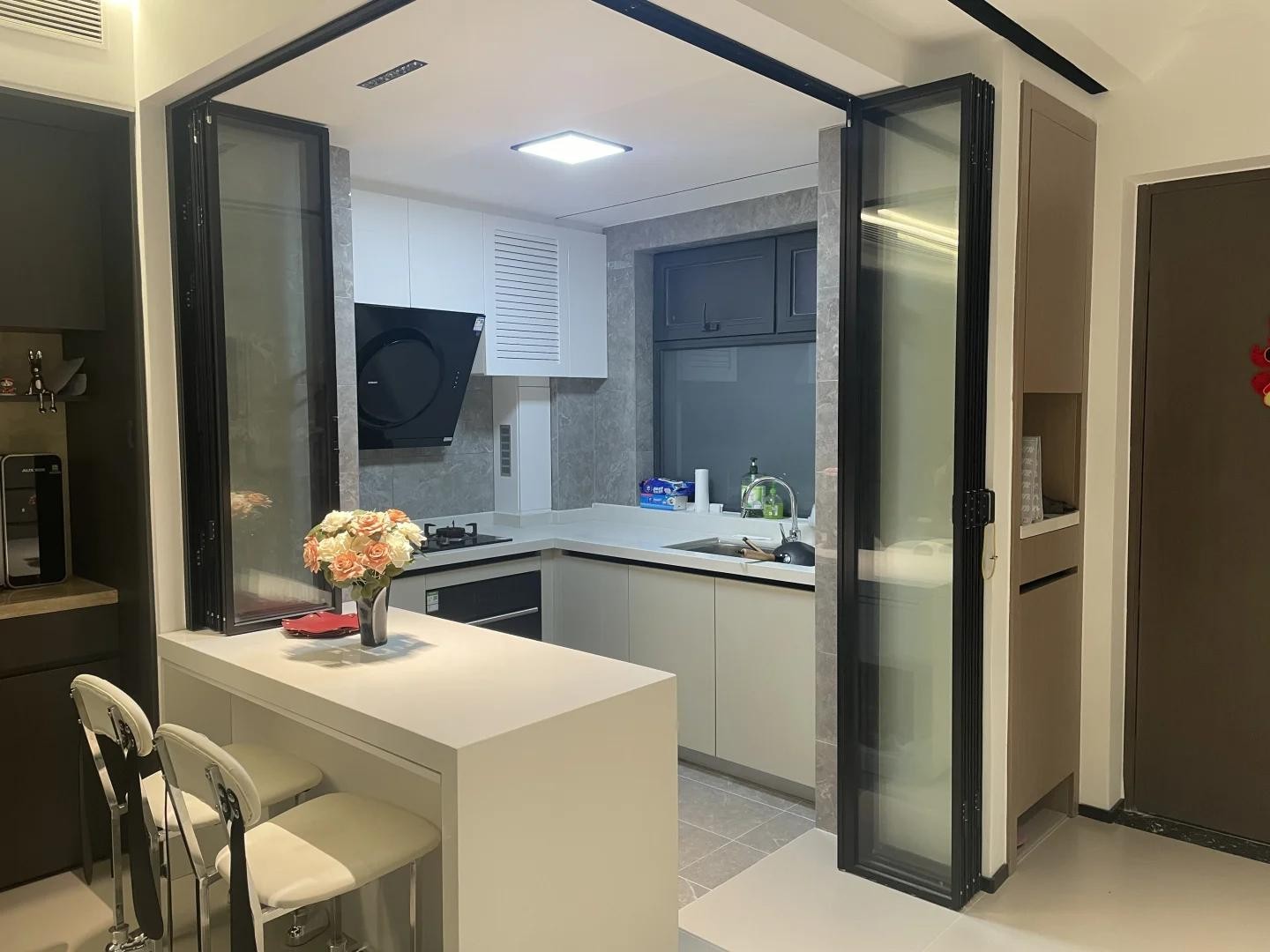 这种折叠门选择的是小块玻璃,而且是顶部轨道,因为它的承重力不像推拉门那样单一,所以顶部轨道也不会有安全隐患,特别是像厨房旁边有岛台的这种设计,可以安装折叠门。