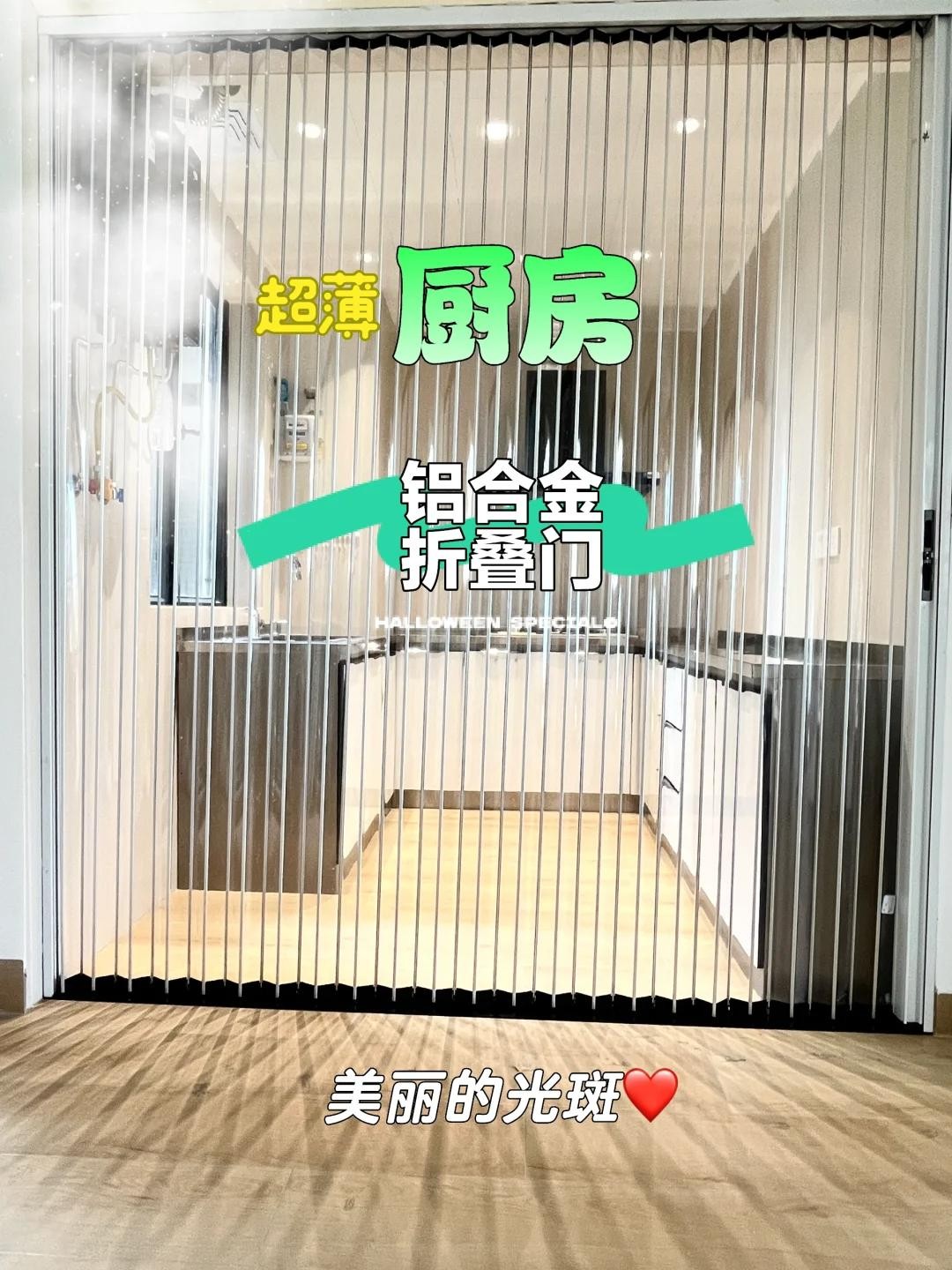 如果你不想要玻璃材质的,还可以直接选择这种铝合金的折叠门,它的门框材质是铝合金的叶片材质是透明水晶板,不仅美观,而且价格很便宜,可以自己安装。这种折叠门具有波光粼粼的美感。