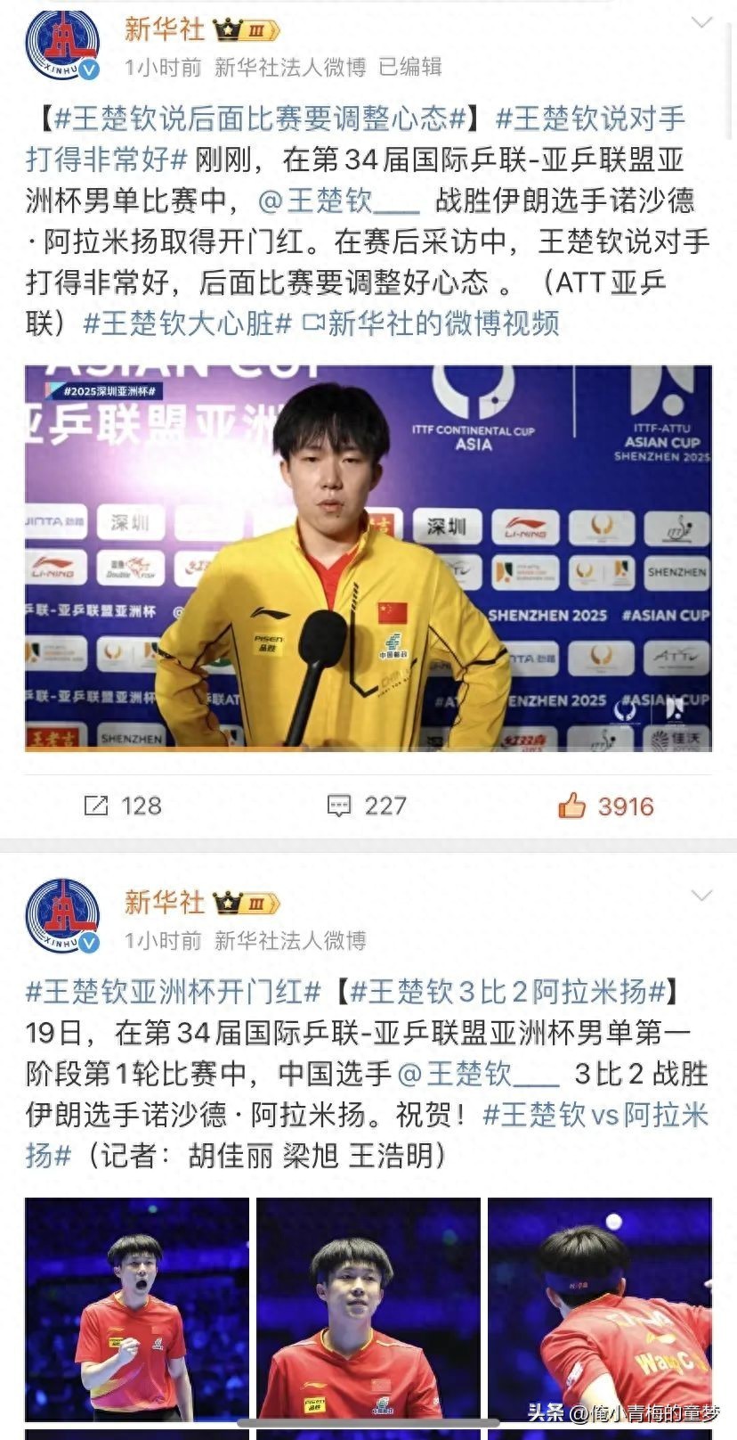 昨晚的比赛我就不再赘述,很多球迷看完都说王皓终于也体验了一把志强教练的心情了,球迷们来来回回进出直播间,只是为了让自己的心脏好受一点,好在最后王楚钦咬住牙,最后接受住了这次考验,3:2险胜了阿拉米扬,赢得了开门红,真的为王楚钦开心!