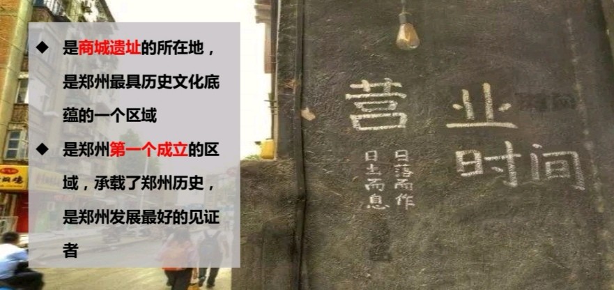 所在地,是郑州第一个建立的城区,致力于把商都历史文化区打造成为有文化、有特色、有内涵、有品牌、有产业、有生态的国际商