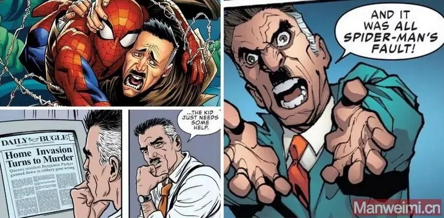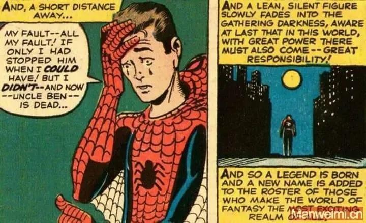但是,正是让彼得成为蜘蛛侠(Spider-Man)后,却因为彼得的一次冷漠,他看到一名抢劫银行的罪犯逃跑,却没有阻止。然而讽刺的是那名罪犯后来杀死的是本叔叔,彼得认为这是他的错,因此他选择成为蜘蛛侠来拯救世界上更多的但人。他发誓再也不会因为蜘蛛侠的不作为,让任何一个无辜的人再遭受这样的痛。经过这种惨痛的经历,他终于知道了,能力越大,责任越大。