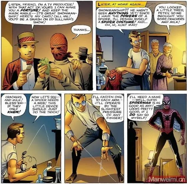 突如其来地获得了这些超能力,让彼得感到很紧张,于是,他设计了一件独特的制服以隐藏自己的身份,做了一对蛛网发射器,然后用“神奇蜘蛛侠”的艺名进军了演艺界,并获得了媒体的关注。
